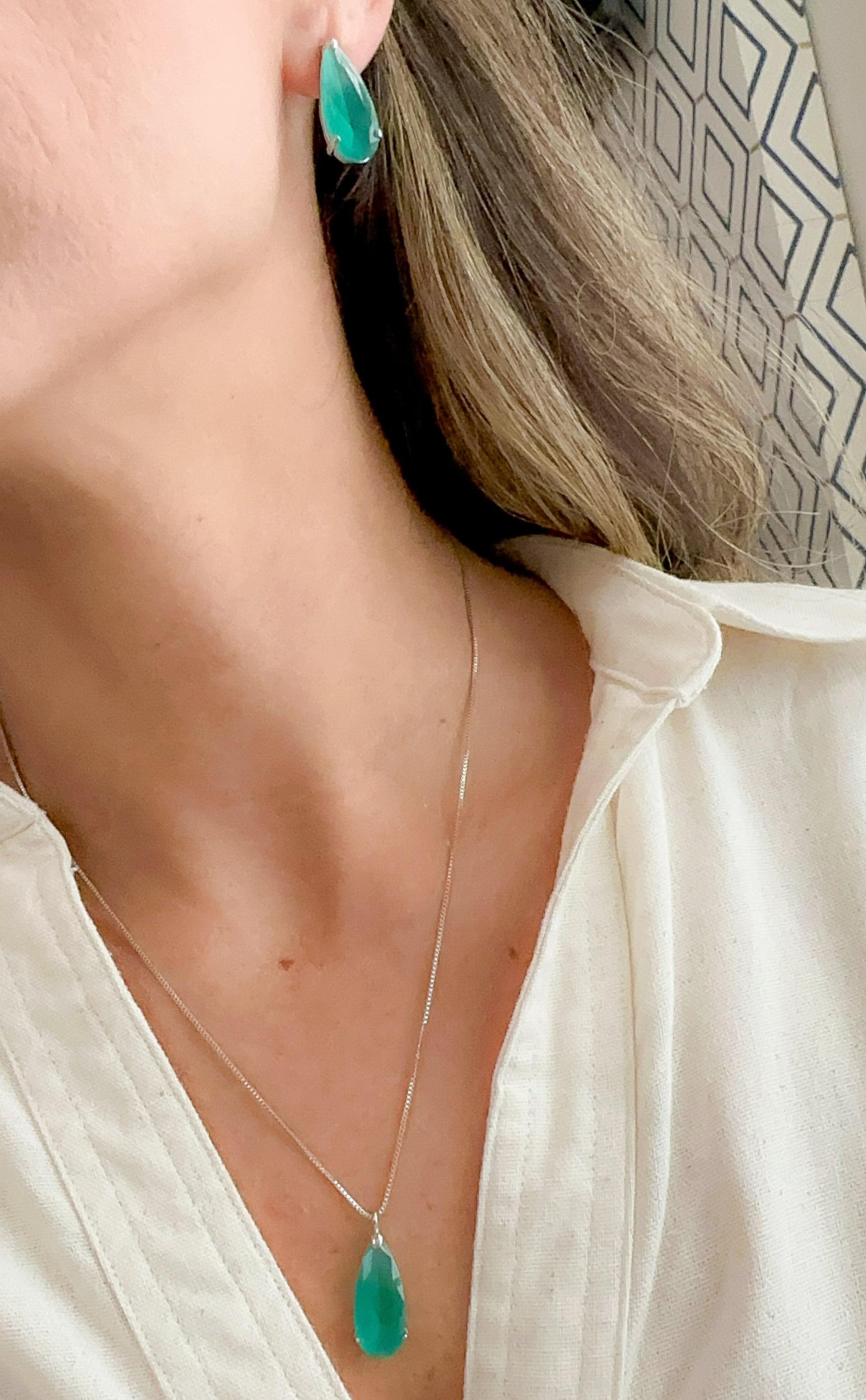 NECKLACE+EARRING SET 22x9 TEAR DROP GREEN TURMALINE CRYSTAL